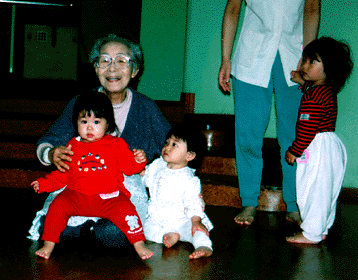 江戸川区の江東園がそれだ。ここは、保育園、特養、養護それに高齢者在宅サービスセンターの四つが同じ敷地内にある複合施設。 一階にある保育園では毎朝九時半から園児とお年寄りが一緒になって体操をするのが日課になっている。体操が終わると園児たちは お年寄りに駆け寄りジャンケンをしたり、おしゃべりしたり、抱っこされたりして遊ぶ。その光景には懐かしささえ覚える。それほど いまの子供達はお年寄りとの接点がないのだ。「ここではホームでお年寄りが亡くなると、子供たちが安置所に焼香に行くんです。 まるでほんとの家族みたいですよ」(同園の特別養護老人ホーム施設長・松本三男さん)。