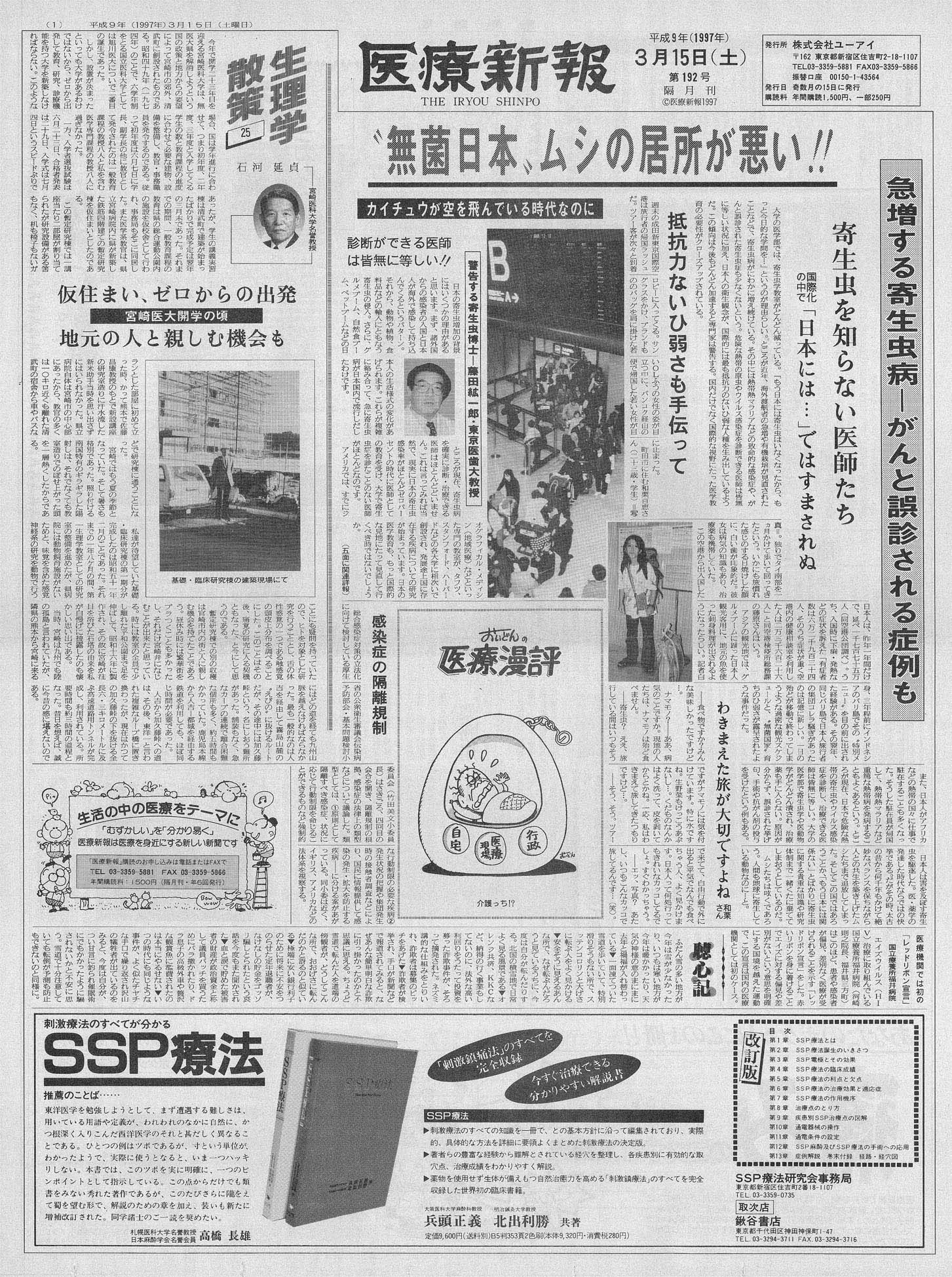 ★これは「空飛ぶ寄生虫」 花粉症、喘息、アトピーなどアレルギーに悩む人が毎年のように増えている。この現象を「物質文明の追求で生じた免疫機能失調症」とみるのは理化学研究所の谷口克・研究センター長。抗生物質が大量に投入され、まるで無菌室のような清潔社会では人の免疫機能がどんどん失われてゆくのである。谷口・センター長はこうも言う。「乳幼児期は抗生物質使用を控えるなど、適度に不衛生なほうがアレルギーになりにくい」。そういえば9年前、藤田紘一郎・東京医科歯科大学医学部教授の『空飛ぶ寄生虫』(講談社刊)を読んで、“目から鱗(うろこ)が落ちる”思いになったのを思い起こす。本紙でも平成9年3月(192号)にトップ記事としてとりあげているが“寄生虫博士”は軽妙な筆致でこうした行き過ぎた「清潔社会」に逸早く警鐘を鳴らしていたのである。